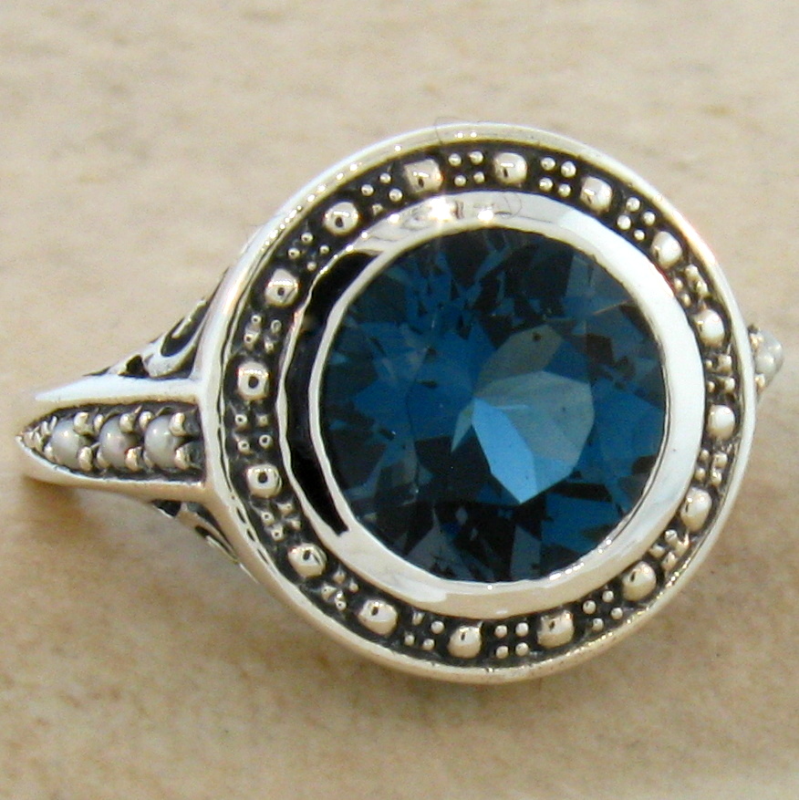 3 Ct GENUINE LONDON BLUE TOPAZ PEARL ANTIQUE STYLE 925 STERLING SILVER RING 289X