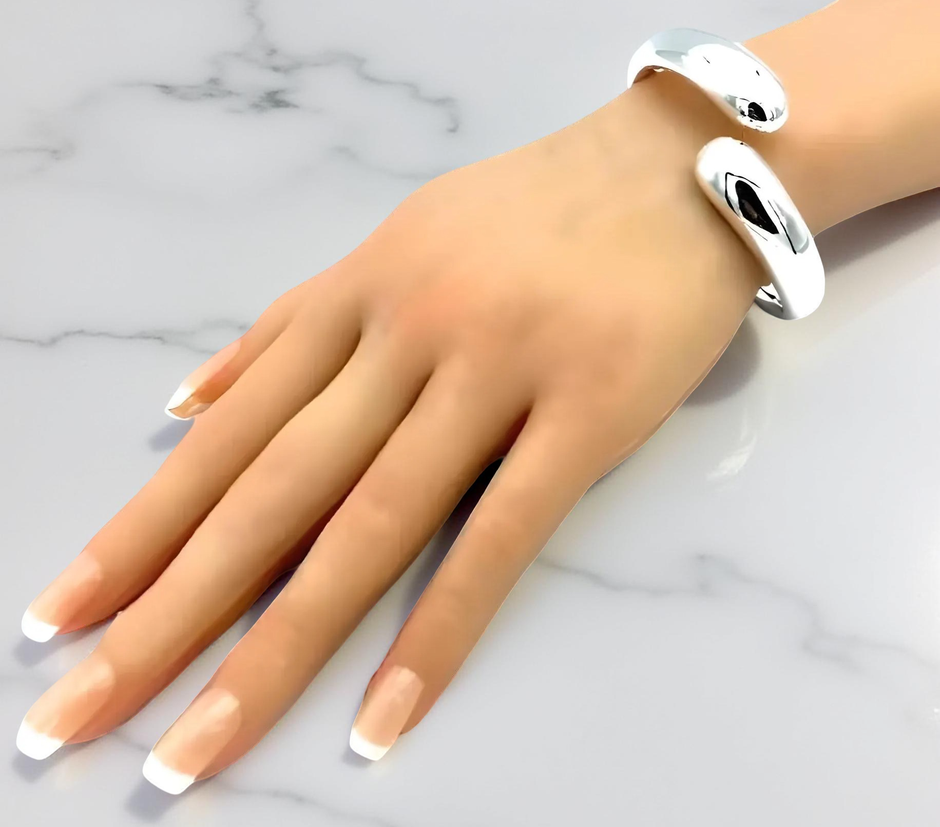 Discover the elegance of simplicity with our exquisite 925 Sterling Silver Bangle Bracelet. This charming piece features a spring hinge for effortless wear, ensuring a comfortable fit for a 6.5-inch (16.5 cm) wrist circumference. Crafted with a hollow form design, it's both lightweight and stylish, perfect for adding a touch of sophistication to any outfit. Embrace the allure of sterling silver and make this delightful bangle your go-to accessory for every occasion. Shop now and indulge in the timeless beauty of silver! Stamped 925.