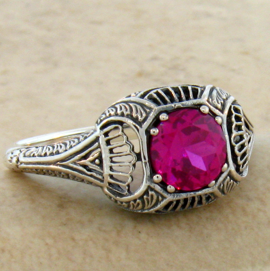 Vivid Red Art Deco Style .925 Solid Sterling Silver Solitaire Filigree Ring. The Top Of The Ring Measures 3/8 Inches, 9.5 mm In Length. This Classic Antique Design Is Set With One High Quality 6mm Lab-Created Ruby Stone. Inspired By The Original Designs Of The Victorian To The Art Deco Period, 1836-1935. Item Is Stamped 925. Our Silver Is Genuine 925 Sterling Silver. This Piece Also Has An Antique Finish For That True Heirloom Look. Specializing in Antique and Vintage Designs