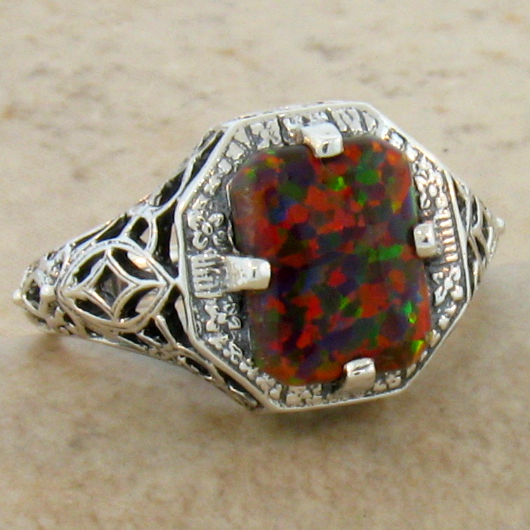 VINTAGE STYLE 925 STERLING SILVER LAB-CREATED RED FIRE OPAL FILIGREE RING #212